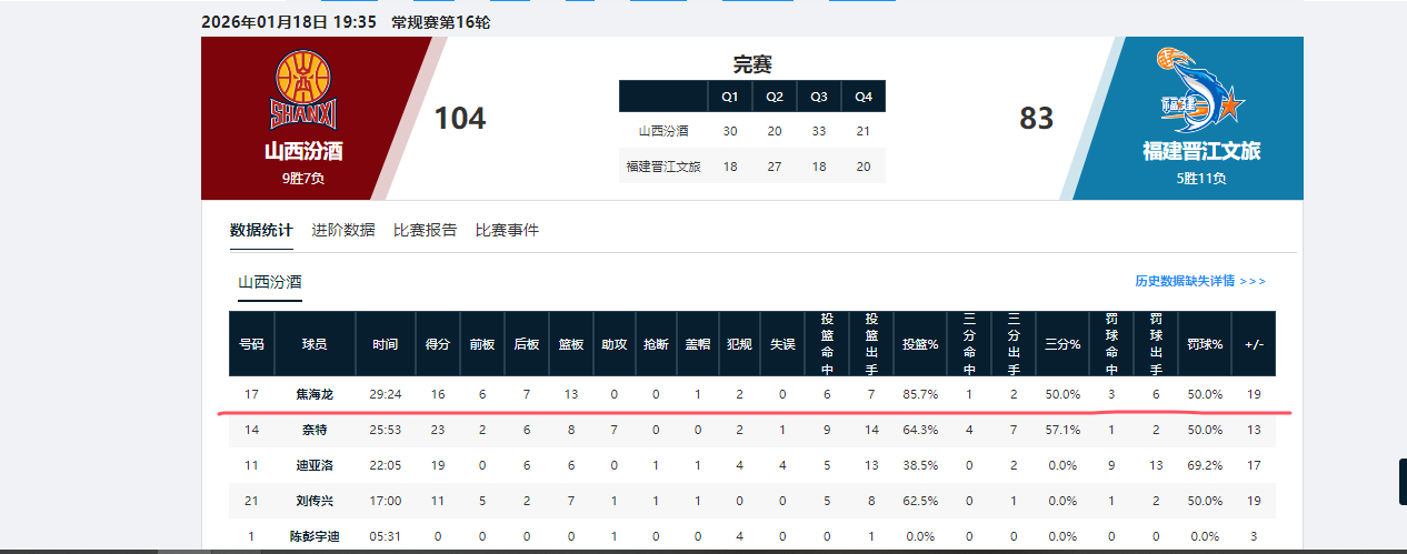 CBA常规赛第16轮,山西男篮坐镇主场104-83完胜福建男篮。本场比赛,山西队前锋焦海龙表现极为亮眼,全场投篮7中6,三分2中1,砍下16分13篮板1盖帽的两双数据,且全程0次失误。其中他的得分数位列全队本土第一,篮板数则是全队第一。