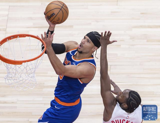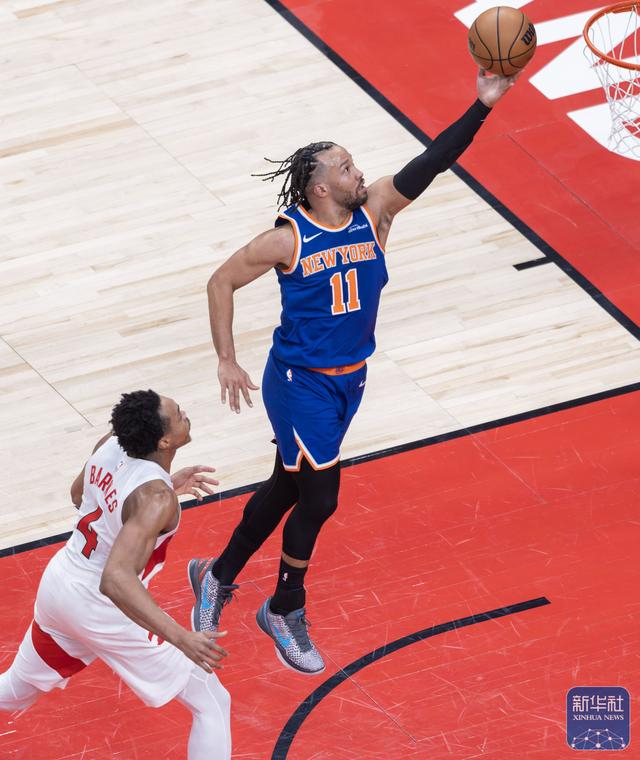 ↑ 尼克斯队球员布伦森(右)在比赛中上篮。