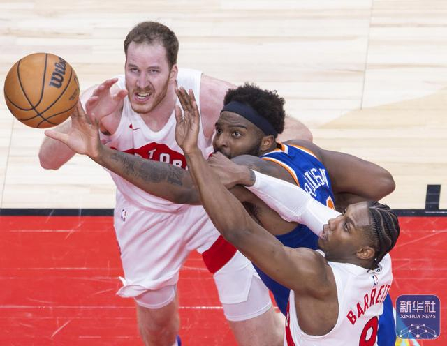 ↑ 猛龙队球员巴恩斯(左)、马穆凯拉什维利(右)与尼克斯队球员罗宾逊在比赛中争抢篮板球。