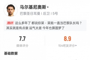 体育资讯6月1日讯 欧冠决赛,巴黎圣日耳曼5-0国际米兰,马尔基尼奥斯首发出战,贡献9次解围,传球成功率95.6%,4次争顶成功全场最多,评分7.7。