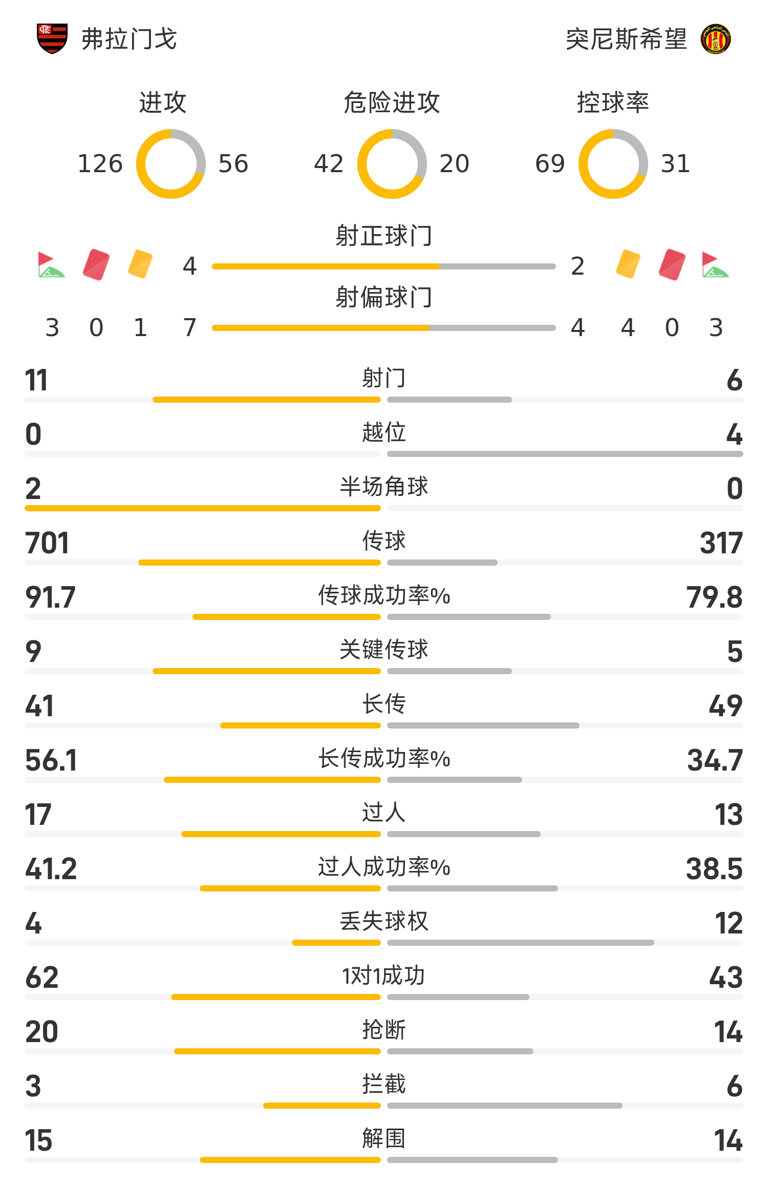 弗拉门戈首发阵容:1-罗西;2-巴雷拉;4-佩雷拉;6-艾尔顿;3-奥尔蒂斯;21-若日尼奥(74’29-阿兰);10-德阿拉斯凯塔(73’30-迈克尔);5-埃里克;8-热尔松(65’50-普拉塔);7-阿劳霍(90’11-埃弗顿);9-佩德罗(65’27-恩里克)